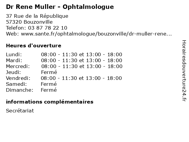 1 Me Anne Muller - Office notarial (Distance: 0,13 km) 6 place du Marché, 57320 Bouzonville anne, assoc, biens, me, muller, notaire, notaires, notarial, office 3 Medecin Rene Schmitt (néphrologue) (Distance: 15,02 km) 6 Place de Conde, 57150 Creutzwald docteur, medecin, néphrologue, rene, sante, schmitt, services 6 Dr Mohamed-Amin Hosni - Ophtalmologue (Distance: 33,08 km) 8 Rue Marie-Anne de Bovet, 57000 Metz amin, cabinet, d'ophtalmologie, dr, hosni, mohamed, ophtalmologie, ophtalmologistes, ophtalmologue, vision |