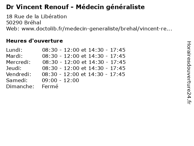 1 Dr Vincent Basseguy - Psychiatre (Distance: 12,54 km) 7 La Genaiterie lieu dit Saint-Ursin, 50320 Saint-Jean-des-Champs basseguy, dr, folie, psychiatre, psychiatrie, psychiatrique, vincent 2 Dr. Blandine Vincent - Dentiste (Distance: 17,26 km) 13 Rue du Palais de Justice, 50200 Coutances blandine, dentiste, docteur, dr., medecins, sante, vincent 3 Le Chef Dans Votre Cuisine (Distance: 35,23 km) Chez Mr Renouf Guy, 50220 Ducey-Les Cheris chef, cuisine, jean, philippe, renouf, restaurants, votre 4 Dr Solene Renouf - Gynecologue Obstetricien (Distance: 37,28 km) 715 Rue Henri Dunant, 50009 Saint-Lô bebe, centre, de, dr, france, gynecologie, gynecologue, hospitalier, lô, maternite, mémorial, obstetricien, obstetrique, renouf, saint, solene, unis, États 6 Pharmacie Benoit Renouf (Distance: 53,90 km) 4 rue Barbey d'Aurevilly, 50390 Saint-Sauveur-le-Vicomte benoit, conseils, médicaments, orthopédie, parapharmacie, pharmacie, renouf |