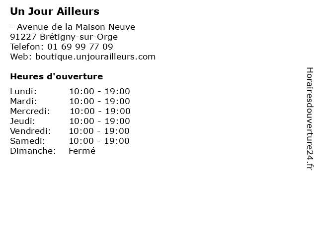 | 1 Un Jour Ailleurs (Distance: 10,13 km) 2 Boulevard de l'Europe, 91000 Evry accessoires, ailleurs, jour, mode, un, vetements 2 Un Jour Ailleurs (Distance: 10,77 km) 2 Rue Jean Cocteau, 91100 Corbeil Essonnes accessoires, ailleurs, jour, mode, un, vetements 3 Un Jour Ailleurs (Distance: 13,99 km) . Avenue de L'Aubrac, 91940 Les Ulis ailleurs, beaute, cafe, chaussures, enfants, jour, lingerie, mode femmes, mode hommes, restaurant, sport, un 4 Un jour ailleurs (Distance: 19,68 km) . Avenue du Luxembourg, 94531 Thais ailleurs, alimentation, beauté & santé, culture & loisirs, enfants, high-tech, jour, maison & déco, mode, restaurants, un 5 Un Jour Ailleurs (Distance: 19,94 km) 94 Val de Marne, 94531 Thiais ailleurs, femme, homme, jour, mode, un 6 Jour de Marche (Distance: 0,02 km) . Avenue de la Maison Neuve, 91227 Bretigny sur Orge beaute, boutiques, chaussures, de, deco, enfants, jour, marche, mode femme, mode hommes, restaurant, sport |