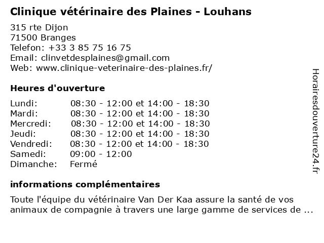 2 Caréco Louhans by APL Autos Pièces Louhans (Distance: 1,91 km) 970 Chemin du Paradis, 71500 Branges apl, autos, by, caréco, louhans, pièces 3 Clinique Vétérinaire du colombier - Louhans - Sevetys (Distance: 3,13 km) 86 Rue du Jura, 71500 Louhans clinique, colombier, du, louhans, sevetys, vétérinaire 4 Cabinet Vétérinaire Docteur Frederic Violot (Distance: 19,07 km) 46 Grande Rue, 39190 Cousance cabinet, docteur, frederic, violot, vétérinaire 5 Clinique vétérinaire Les Rives de Saone (accueil) (Distance: 19,17 km) 7 Rue Pranet Zac de Velard, 71370 Ouroux sur saone accueil, clinique, de, l'accueil, les, medical, ouverture, rives, saone, services, veterinaire, vétérinaire 6 Clinique vétérinaire Les Rives de Saone (Consultations) (Distance: 19,17 km) 7 Rue Pranet Zac de Velard, 71370 Ouroux sur saone clinique, consultations, de, les, medical, rendez, rives, saone, services, sur, veterinaire, vous, vétérinaire |