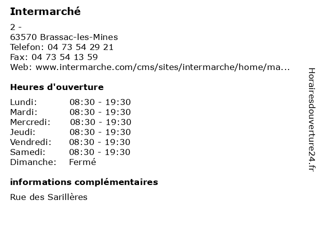 1 Intermarché station-service Brassac-les-Mines (Distance: 0,24 km) 2 Rue des sarillères, 63570 Brassac-les-Mines brassac, intermarché, les, mines, service, station 2 Intermarché location Brassac-les-Mines (Distance: 0,24 km) 2 Rue des sarillères, 63570 Brassac-les-Mines brassac, intermarché, les, location, mines 3 Intermarché station-service Brassac-les-Mines (Distance: 0,73 km) 2 Rue des Sarillères, 63570 Brassac-les-mines brassac, intermarché, les, mines, service, station 4 Opticien Brassac-les-Mines - Optic 2000 - Centre commercial Intermarché (Distance: 0,84 km) 2 Rue des Sarailleres, 63570 Brassac-les-Mines 2000, brassac, centre, commercial, intermarché, lentilles de contact, les, lunettes de soleil, lunettes de vue, mines, optic, optic2000, opticien, opticien optic2000, ray-ban, rayban 5 Intermarché SUPER Brassac-les-Mines (Distance: 0,84 km) 2 Rue des sarillères, 63570 Brassac-les-Mines brassac, intermarché, les, mines, super 6 Intermarché station-service Cohade (Distance: 10,64 km) Flageac, 43100 Cohade cohade, intermarché, service, station |