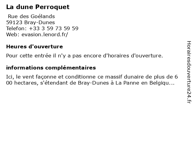 2 Camping du Perroquet (Distance: 1,91 km) - Rue des Dunes, 59123 Bray-Dunes camping, du, perroquet, vacances 3 la Réserve Naturelle Nationale Dune Marchand (Distance: 2,33 km) Rue du Large, 59123 Bray-Dunes dune, la, marchand, nationale, naturelle, réserve 4 La dune Fossile de Ghyvelde (Distance: 3,31 km) Rue de la Frontière, 59254 Ghyvelde de, dune, fossile, ghyvelde, la 5 Maison d’Accueil Spécialisée (MAS) La Dune aux Pins (Distance: 3,59 km) 255 Rue de la Frontière, 59254 Ghyvelde aux, dune, d’accueil, la, maison, mas, organisme, pins, social, spécialisée 6 |