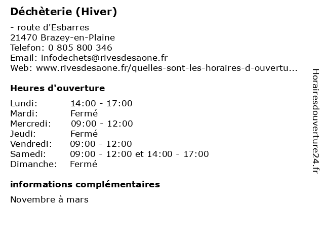 1 Déchèterie (Hiver) (Distance: 0,00 km) - route d'Esbarres, 21470 Brazey-en-Plaine bennes, débarras, déchèterie, détritus, hiver, mars, novembre, ordures, poubelles 2 Déchèterie (Hiver) (Distance: 11,70 km) - route de Dijon, 21250 Auvillars-Sur-Saône bennes, débarras, déchèterie, détritus, hiver, mars, novembre, ordures, poubelles 3 Déchèterie (Hiver) (Distance: 12,08 km) - route de Pagny, 21250 Seurre bennes, débarras, déchèterie, détritus, hiver, mars, novembre, ordures, poubelles 4 Déchèterie (Hiver) (Distance: 14,58 km) 10 rue du Luxembourg, 39500 Tavaux déchèterie, gravats, hiver, huiles usées, la réception des déchets et écocentres, les appareils électroménagers, les déchets verts, papier et carton en quantité 5 Déchèterie (Hiver) (Distance: 17,76 km) - lieu-dit de la Quenissière, 21910 Saulon-La-Chapelle bennes, débarras, déchèterie, détritus, hiver, mars, novembre, ordures, poubelles 6 Déchèterie (hiver) (Distance: 19,00 km) - Zone Industrielle, 39120 Chaussin déchèterie, gravats, hiver, huiles usées, la réception des déchets et écocentres, les appareils électroménagers, les déchets verts, papier et carton en quantité |