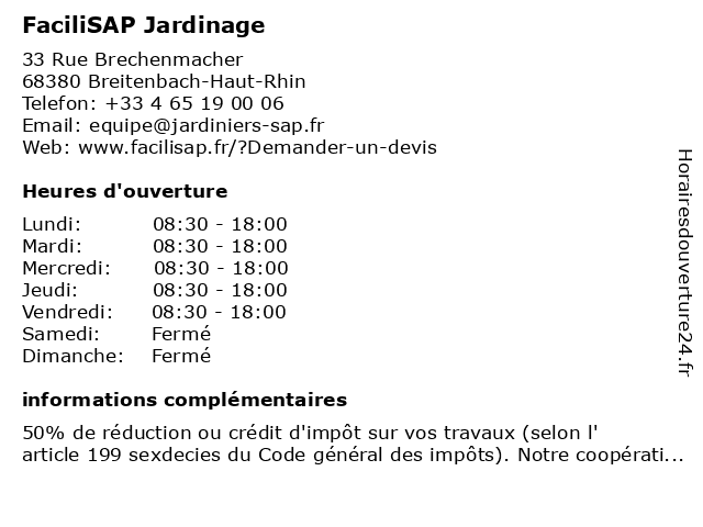2 FaciliSAP Nettoyage COLMAR (Distance: 18,25 km) 2 Rue d'Amsterdam, 68000 Colmar colmar, facilisap, nettoyage 3 O2 Home Services (Distance: 14,27 km) 5 Rue du Printemps,, 68500 Orschwihr aide aux seniors, garde d'enfants, handicap, home, incapacite temporaire, jardinage, menage repassage, o2, services 4 Kiriel (De avril à mai) (Distance: 15,23 km) - Rue de Wiggensbach, 68420 Obermorschwihr animalerie, avril, de, jardinage, jardinerie, kiriel, mai 5 Kiriel (Horaires d'hiver) (Distance: 15,23 km) - Rue de Wiggensbach, 68420 Obermorschwihr affaires, centre, d'hiver, horaires, jardinage, kiriel, produit, service 6 Point Vert (Distance: 17,84 km) 13 Boulevard de la Jamagne, 88400 Gérardmer animal domestique, animaux, intérieur, jardin, marché aux fleurs, outils de jardinage, point, vert, votre, vêtements |