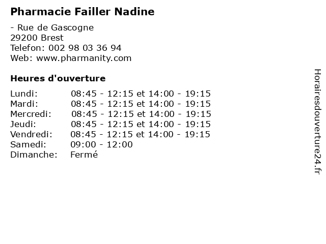 1 Dr Nadine Hallinger - Médecin généraliste (Distance: 2,11 km) 16 Rue Turgot, 29200 Brest docteur, dr, generaliste, généraliste, hallinger, medical, médecin, nadine, soin 2 Dr Nadine Jay - Pédiatre (Distance: 2,65 km) 2 Avenue Maréchal Foch, 29200 Brest consultation, docteur, dr, jay, med, médecin, nadine, pediatre, pédiatre, traitement 3 Failler Emmanuelle (Distance: 15,01 km) 5 Rue Duguesclin, 29800 La Forest-Landerneau emmanuelle, failler 4 Tabac Le Brigantin (Distance: 0,56 km) 610 Rue De Normandie, 29200 Brest boissons, brigantin, fdj, kerbrat, le, nadine, pmu, tabac 5 Pharmacie Blanchard (Distance: 0,78 km) - Place Napoléon III, 29200 Brest aromatherapie, blanchard, médical, médicaments, paramédical, parapharmacie, pharmacie, santé, traitements 6 Chez Ma Pharmacienne (Distance: 1,50 km) 17 rue Cuirassé Bretagne, 29200 Brest aromatherapie, chez, ma, médical, médicaments, paramédical, parapharmacie, pharmacie, pharmacienne, santé, traitements |