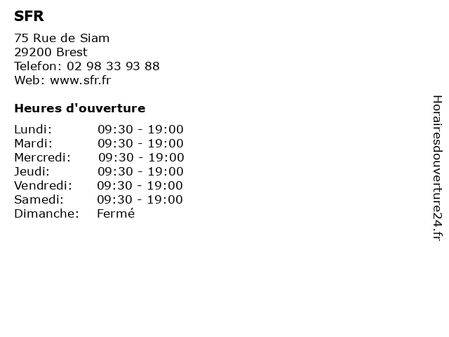 2 SFR (Distance: 0,73 km) 12 Rue Victor Hugo, 29200 Brest abonnements de téléphonie mobile ou fixe fixe ou carte prépayée, accès internet haut débit ou la fibre optique ainsi que des abonnements à des bouquets de chaînes de télévision ., sfr, téléphones mobiles 3 SFR (Distance: 2,32 km) 29 Route de Gouesnou, 29200 Brest beaute, cafe, chaussures, enfants, hommes, lingerie, mode femmes, restaurant, sfr, sport 4 SFR (Distance: 2,73 km) 126 boulevard de Plymouth, 29200 Brest accessoires de téléphonie mobile, boutique de téléphonie mobile, communications mobiles, contrats de téléphonie mobile, sfr, téléphone portable 5 SFR (Distance: 18,62 km) 52 Quai Léon, 29800 Landerneau abonnements de téléphonie mobile ou fixe fixe ou carte prépayée, accès internet haut débit ou la fibre optique ainsi que des abonnements à des bouquets de chaînes de télévision ., sfr, téléphones mobiles 6 SFR Brest Siam (Distance: 0,00 km) 75 Rue De Siam, 29200 Brest brest, compagnie de téléphone, magasin de téléphones mobiles, sfr, siam, vente et installation du câble et du satellite |