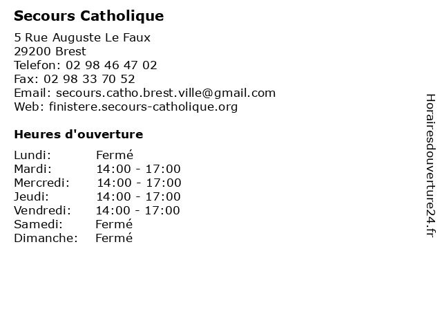 1 Secours Catholique (Distance: 2,12 km) 3 Rue Watteau, 29200 Brest accueil, association, catholique, organisation, secours 2 Secours Catholique (Distance: 6,30 km) 1 rue de la Fontaine, 29850 Gouesnou accueil, association, catholique, organisation, secours 3 Secours Catholique (Distance: 6,68 km) 1 Rue Le Reun, 29480 Le Relecq-Kerhuon accueil, association, catholique, organisation, secours 4 Secours Catholique (Distance: 7,66 km) 1 Rue Amiral Guepratte, 29490 Guipavas accueil, association, catholique, organisation, secours 5 Secours Catholique (Distance: 10,00 km) 1 Rue de Saltach, 29280 Plouzane accueil, association, catholique, organisation, secours 6 Secours Catholique (Distance: 11,17 km) 1 Rue Racine, 29820 Saint-Renan accueil, association, catholique, organisation, secours |