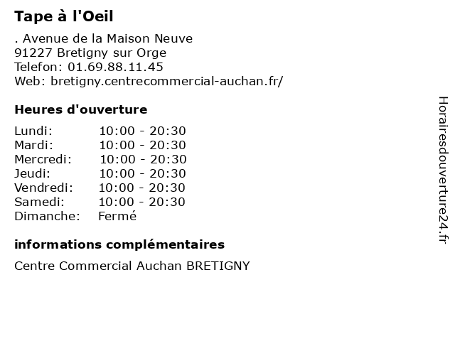 1 Tape à l'oeil (Distance: 4,88 km) 22 avenue de la Croix Blanche, 91700 Sainte-Geneviève-des-Bois enfants, l'oeil, mode, tape, vêtements 2 Tape à l'oeil - Sainte Genevieve des Bois (Distance: 4,86 km) 22 Avenue De La Croix Blanche, 91700 Sainte Genevieve des Bois bois, des, genevieve, l'oeil, magasin de vêtements pour bébés, mode, sainte, salon de coiffure, tape 3 Tape Ta Crêpe (Distance: 9,21 km) 6 Rue du Plessis Briard, 91080 Evry-Courcouronnes crepe, crêpe, cuisine, menus, repas, restaurants, ta, tape 4 Tape à l'oeil - VILLEBON-SUR-YVETTE (Distance: 13,55 km) Shopping Villebon 2, 91140 VILLEBON-SUR-YVETTE l'oeil, magasin de vêtements pour bébés, mode, sur, tape, villebon, yvette 5 O Coin de l'Oeil (Distance: 13,87 km) 18 place de la Libération, 91640 Briis-sous-Forges coin, de, l'oeil, lunettes, monture, opticien, optique, solaire, vue 6 Tape à l'oeil - Lieusaint (Distance: 18,17 km) 3 Allée Du Préambule, 77127 Lieusaint l'oeil, lieusaint, magasin de vêtements pour bébés, mode, tape |