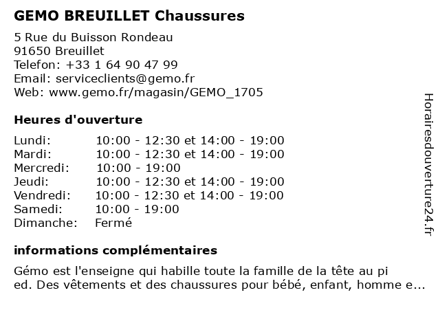 1 GEMO (Distance: 7,75 km) 20 Route Nationale, 91620 La Ville Du Bois cafe, chaussures, enfants, gemo, homme, mode femme, restaurant, service 2 Chaussures Arbell & Co (Distance: 10,73 km) . Avenue de la Maison Neuve, 91220 Brétigny-sur-Orge accessoires, arbell, chaussure, chaussures, co, mode 4 Gemo (Distance: 13,83 km) . Ville de Bois, 91620 La Ville du Bois beaute, cafe, chaussures, enfants, gemo, hommes, lingerie, mode femmes, restaurant, sport 5 D'Orsay Chaussures (Distance: 14,47 km) 5 rue Verrier, 91400 Orsay accessoires, capanna, chaussures, d'orsay, enfants, magasins 6 GEMO VILLEBON S/YVETTE Chaussures et Vêtements (Distance: 16,38 km) Avenue de la Plesse, 91140 Villebon-sur-Yvette bijoux et accesoires, chaussures, et, gemo, lingerie, magasin bébé, maroquinerie, mode et habillement, s/yvette, villebon, vêtements, vêtements bébé, vêtements enfant, vêtements femme, vêtements homme |