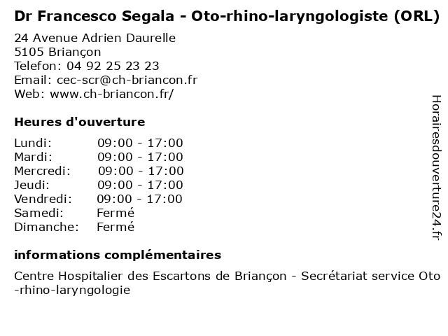 1 Dr M'Hamed Alami - Oto-rhino-laryngologiste (ORL) (Distance: 0,00 km) 24 Avenue Adrien Daurelle, 05105 Briançon alami, dr, laryngologie, laryngologiste, m'hamed, orl, oto, rhino 2 Dr Sami Wajsbrot - Oto-rhino-laryngologiste (ORL) (Distance: 0,00 km) 24 Avenue Adrien Daurelle, 05105 Briançon dr, laryngologie, laryngologiste, orl, oto, rhino, sami, wajsbrot 3 Centre Hospitalier des Escartons - Oto-rhino-laryngologie (secrétariat ) (Distance: 0,13 km) 5 avenue Daurelle, 05100 Briancon centre, consultation, des, docteur, escartons, hospitalier, laryngologie, oto, rhino, santé, secrétariat 4 Dr Flavio Perottino - ORL (Distance: 1,18 km) 15 Route du Poët Ollagnier, 05100 Briancon consultation, docteur, dr, flavio, laryngologie, orl, oto, perottino, rhino, santé 5 Di Francesco Hugues Isabelle (Distance: 41,84 km) Deux Alpes, 38860 Mont De Lans di, francesco, hugues, isabelle, restaurants 6 Dr Francesco Segala ORL - Chirurgien de la face et du cou (Distance: 58,05 km) 9 Rue Antonin Coronat, 05000 Gap chirurgien, cou, de, docteur, dr, du, et, face, francesco, la, orl, sante, segala, soins |