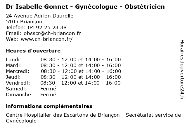 | Lundi | 08:30-12:00 et 14:00-16:00 |