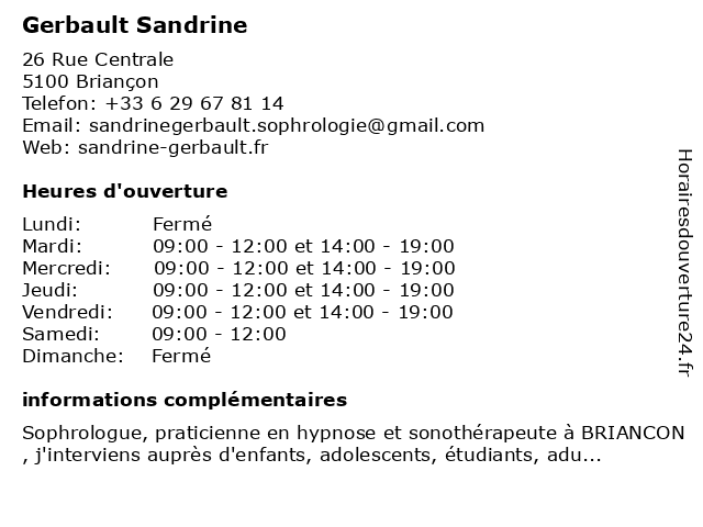 1 Armand Sandrine Valerie (Distance: 52,48 km) Galerie Du Peclet La Confiserie, 73440 Les Belleville armand, boulangeries, détail, sandrine, valerie 2 Areas Assurances (Distance: 54,99 km) - Rue des Fosses, 38970 Corps areas, assurances, nicolas, sandrine, santé, services 3 La Rose Noire (Distance: 56,66 km) 15 Rue Du Commandant Edouard Car, 04400 Barcelonnette garguil, lea, noire, restaurants, rose, sandrine 4 Cabinet Detent' Equilibre -Sandrine Thomas Coach Santé-Bien-être (Distance: 57,36 km) 5e Cours Ladoucette, 05000 Gap bien, cabinet, coach, detent', equilibre, sandrine, santé, thomas, être 5 Dr Sandrine Pelsy - Médecin généraliste (Distance: 59,73 km) 7 rue des Marronniers, 05000 Gap consultation, docteur, dr, dr., générale, généraliste, médecin, médecine, pelsy, sandrine, santé |