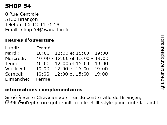 | Samedi | 10:00-12:00 et 15:00-19:00 |