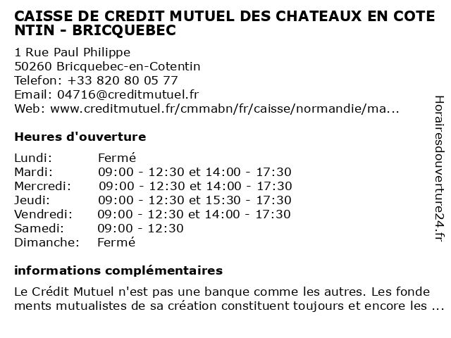 1 Crédit Mutuel (Distance: 0,01 km) 1 Rue Paul Philippe, 50260 Bricquebec En Cotentin compagnie de téléphone, crédit, mutuel, organisme d'assurance 2 CAISSE DE CREDIT MUTUEL DES CHATEAUX EN COTENTIN (Distance: 11,98 km) 13 Place Auguste Cousin, 50390 Saint-Sauveur-le-Vicomte caisse, chateaux, cotentin, credit, de, des, en, mutuel 3 CAISSE DE CREDIT MUTUEL DE LA HAYE DU PUITS - BARNEVILLE (Distance: 13,08 km) Place de l'Église, 50270 Barneville-Carteret barneville, caisse, credit, de, du, haye, la, mutuel, puits 4 CAISSE DE CREDIT MUTUEL DE LES PIEUX (Distance: 13,46 km) 48 Rue Centrale, 50340 Les Pieux caisse, credit, de, les, mutuel, pieux 5 CAISSE DE CREDIT MUTUEL DE CHERBOURG SCHUMAN - OCTEVILLE (Distance: 17,58 km) 31 Rue Roger Salengro, 50130 Cherbourg-en-Cotentin caisse, cherbourg, credit, de, mutuel, octeville, schuman 6 Crédit Mutuel (Distance: 18,08 km) 14 Boulevard Félix Eboué, 97100 Basse-Terre agence, assurance, bancaire, banque, crédit, mutuel |