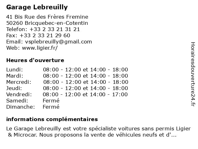 1 Le Versailles Normand (Distance: 12,10 km) 5 Place Vicq d Azir, 50700 Valognes lebreuilly, normand, restaurants, versailles 2 Boucherie Lebreuilly (Distance: 55,60 km) 9 rue du Belle, 50000 Saint-Lô boucher, boucherie, charcuterie, charcutier, lebreuilly, traiteur 3 Elan Station (Garage Renault) (Distance: 1,08 km) . Route de Cherbourg, 50260 Bricquebec carburant, elan, entretien, essence diesel, garage, gazole, renault, réparation, sp95, station 4 Bricqauto SARL (Distance: 1,25 km) - Zone d'activité route de Portbail, 50260 Bricquebec auto, bricqauto, entretien, garage, réparation, sarl, service, voiture 5 Point S - Bricqauto (Distance: 1,29 km) - ZA route de Portbail, 50260 Bricquebec auto, bricqauto, garage, pneus, point, réparation, véhicules 6 Confort Auto / Garage Mauduit (Distance: 9,77 km) 5 Tapotin, 50700 Yvetot-Bocage auto, automobile, automoto, autovision, confort, contrôle technique, garage, mauduit |
