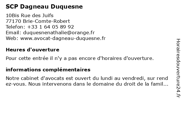 1 Maître Christine Dagneau-Bachimont - Avocate (Distance: 0,01 km) 10 bis rue des Juifs, 77170 Brie-Comte-Robert avocate, avocats, bachimont, christine, civils, dagneau, droits, juridiques, maître 2 SCP DE CHIRURGIENS DENTISTES GIUNTA (Distance: 9,84 km) 12 Rue Louise Chenu, 94470 Boissy Saint Léger chirurgiens, de, dentistes, giunta, scp 3 SCP X. Blanc M. Grassin Huissiers boissy saint léger (Distance: 9,99 km) 22 Avenue du Général Leclerc, 94470 Boissy-Saint-Léger blanc, boissy, grassin, huissiers, léger, m., saint, scp, x. 4 SCP François Le Discorde Salomé - Huissiers de justice (Distance: 10,29 km) 31 Rue Henri Beaudelet, 77330 Ozoir la Ferrière cabinet, de, discorde, françois, françois le discorde salomé scp -huissier de justice, huissier, huissiers, justice, le, salomé, scp 5 SCP 106 Republique (Distance: 12,34 km) 106 avenue République, 77340 Pontault-Combault 106, republique, scp 6 Scp Cabart-Hachette-Bretenoux (Distance: 12,70 km) 5 Rue de l'Église, 77176 Nandy bretenoux, cabart, hachette, scp |