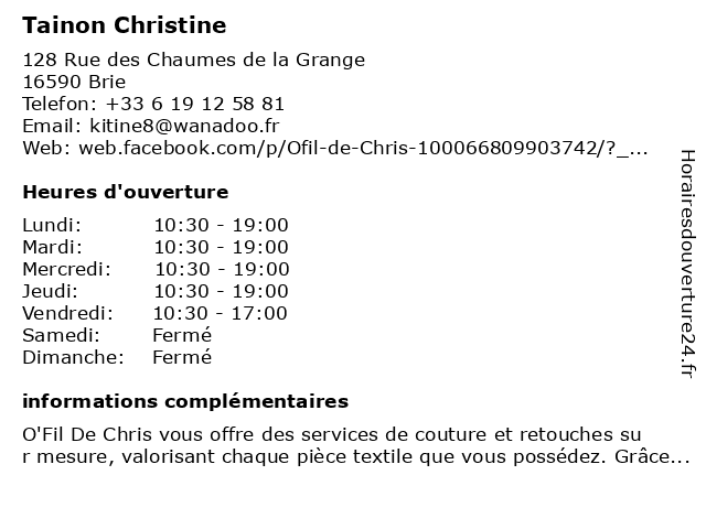 1 Dr Christine Ayestaran - Radiologue (Distance: 9,59 km) 10 chemin de Frégeneuil, 16800 Soyaux ayestaran, christine, consultation, docteur, dr, med, médecin, médecine, radiologue, traitement 2 Dr Christine Auger-Laurent - Radiologue (Distance: 10,41 km) 2 route de Chazelles, 16110 La Rochefoucauld auger, christine, consultation, docteur, dr, laurent, med, médecin, médecine, radiologue, traitement 3 Dr Christine Ayestaran - Radiologue (Distance: 10,41 km) 2 route de Chazelles, 16110 La Rochefoucauld ayestaran, christine, consultation, docteur, dr, med, médecin, médecine, radiologue, traitement 4 Dr Christine Ayestaran - Radiologue (Distance: 11,04 km) 51 avenue du Président Wilson, 16000 Angoulême ayestaran, christine, consultation, docteur, dr, med, médecin, médecine, radiologue, traitement 5 Dr Christine Auger-Laurent - Radiologue (Distance: 11,04 km) 51 avenue du Président Wilson, 16000 Angoulême auger, christine, consultation, docteur, dr, laurent, med, médecin, médecine, radiologue, traitement 6 Maître Christine Morand-Leonetti - Avocate (Distance: 12,97 km) 14 rue Robert Doisneau, 16000 Angoulême avocat, avocate, christine, droit, juridictionnelle, leonetti, maître, morand, négociation |