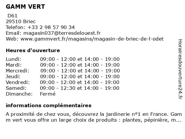2 Gamm vert (Distance: 14,34 km) . KERGOALER, 29300 QUIMPERLE animalerie, animaux, gamm, horticulteur, jardin, jardinerie, vert 3 GAMM VERT (Distance: 15,67 km) ZA de Carn ar Hoat, 29550 Plonévez-Porzay animalerie, gamm, jardin, jardinerie, mobilier de jardin, plantes, pépinière, vert 5 Gamm vert (Distance: 17,94 km) Rue de Morlaix, 29520 Châteauneuf-du-Faou animalerie, gamm, jardin, jardinerie, mobilier de jardin, plantes, pépinière, vert 6 GAMM VERT (Distance: 19,56 km) Zone d'aménagement différé de Dioulan, 29140 Rosporden animalerie, gamm, jardin, jardinerie, mobilier de jardin, plantes, pépinière, vert |