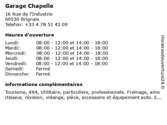 1 Euromaster Garage Chapelle - Brignais (Distance: 0,00 km) 16 Rue de l'Industrie, 69530 Brignais batterie voiture, brignais, centre auto, chapelle, essuie glace, euromaster, garage, garage auto, garage automobile, garagiste, liquide de frein, parallélisme, plaquette de frein, pneu, pneu 4 saisons, pneu hiver, pneu michelin, pneu pas cher, pneus, pneus pas cher, pneus pas chers, pression pneu, promo pneu, recharge clim voiture, revision voiture, vidange, vidange voiture 2 Carrosserie Axial - Carrosserie Chapelle (Distance: 4,25 km) 75 Chemin De La Mouche, 69230 Saint Genis Laval atelier, automobile, axial, carrosserie, chapelle, garage, reparation, véhicule 3 Dominique de La Chapelle - Masseur-kinésithérapeute (Distance: 10,23 km) 2 Rue Sala, 69002 Lyon chapelle, consultation, de, docteur, dominique, kinésithérapeute, la, masseur, med, médecin, traitement 4 Basilique de Fourvière - Chapelle (Distance: 10,71 km) - place de Fourvière, 69005 Lyon basilique, chapelle, de, fourvière, historiques, monuments, tourisme, visite 5 Maître Guillaume de la Chapelle - Avocat (Distance: 13,18 km) 119 Boulevard de Stalingrad, 69100 Villeurbanne avocat, chapelle, de, guillaume, justice, la, lois, maitre, maître 6 Les Pizzas De La Chapelle (Distance: 16,77 km) Monsieur Florian Rousseau, 69850 Saint Martin En Haut chapelle, florian, pizzas, restaurants, rousseau |
