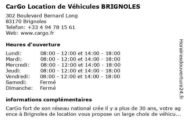 2 CarGo (Distance: 0,34 km) - route de Marseille lieu dit les Plans, 83170 Brignoles cargo, france, location de voiture, service 3 Peugeot - Groupe Chopard - Véhicules neufs (Distance: 0,54 km) n/c route Nationale 7, 83170 Brignoles atelier, automobile, chopard, concessionnaire, garage, groupe, neuf, neufs, neuve, occasion, peugeot, réparation, vente, véhicule, véhicules 4 CarGo Sari-Loc Franchisé Indépendant (Distance: 1,14 km) Route de Marseille, 83170 Brignoles cargo, franchisé, indépendant, loc, sari 5 Intermarché location Brignoles (Distance: 2,32 km) Route de Nice, 83170 Brignoles brignoles, camions, intermarché, location 6 Ford - Véhicules Neufs (Distance: 5,40 km) n/a Route de Nice, 83170 Brignoles atelier de carrosserie, auto, car, financement, ford, ford entreprise, neufs, pièces et accessoires, véhicules, véhicules d’occasion, véhicules neufs |