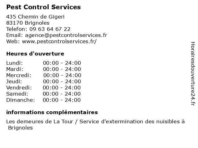 1 AFPAH (Distance: 29,43 km) 116 Avenue de Digne, 83130 La Garde afpah, dératisation, extermination, nuisibles, services 2 Pest Control Services (Distance: 33,45 km) 111 Avenue Maréchal Lyautey, 83000 Toulon antiparasitaire, control, detection, extermination, lutte, pest, services, stérilisation 3 Nuisix (Distance: 33,77 km) 31 Rue chevalier paul, 83000 Toulon anti insectes, blattes, cafards, dératisation, désinsection, désinsectisation, exterminateurs, lutte antiparasitaire, nuisix, punaises des lits, rats, souris, traitement contre les nuisibles 4 Pest Control Services (Distance: 42,14 km) s/n Route Nationale 7, 83550 Vidauban antiparasitaire, control, detection, extermination, lutte, pest, services, stérilisation 5 3DSud (Distance: 48,35 km) 6 Place Jean Mermoz, 83120 Sainte-Maxime 3dsud, antiparasitaire, detection, extermination, lutte, stérilisation 6 Attrap 13 Nuisibles (Distance: 50,65 km) 33 Rue Frédéric Joliot Curie, 13013 Marseille 13, antiparasitaire, attrap, detection, extermination, lutte, nuisibles, stérilisation |