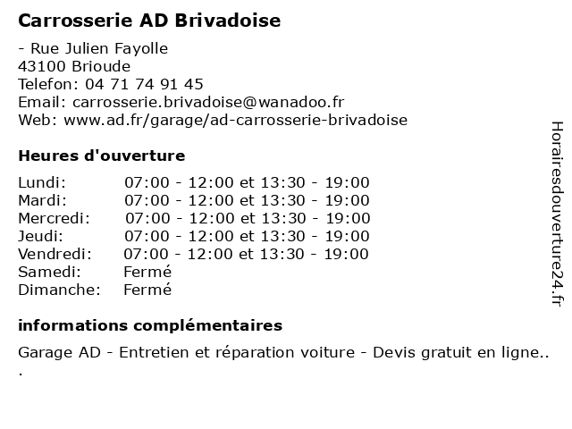 1 Crèmerie Brivadoise (Distance: 2,34 km) 23 Place Eugène Gilbert, 43100 Brioude alimentation, brivadoise, crèmerie, fromage, fromagerie, épicerie 2 Pétanque Brivadoise (Distance: 2,56 km) - Route de Lamothe, 43100 Brioude activités, brivadoise, club, pétanque, sportif, sportive, sports 3 Carrosserie Trevis Philippe (Distance: 8,04 km) Route de Brassac, 43360 Vergongheon carrosserie, philippe, trevis 4 Carrosserie Trevis Philippe - Motrio (Distance: 9,87 km) 2 Rue de Megecoste, 43250 Sainte-Florine carrosserie, devis en ligne, dépannage auto sainte florine, garage automobile 43, garage automobile à proximité, garage automobilesainte florine, garage motrio sainte florine, garage multimarque, garage sainte florine, motrio, philippe, pneus motrio, trevis 5 Carrosserie Florinoise (Distance: 11,97 km) 37bis Rue Ambroise Thomas, 43250 Sainte-Florine automobile, carrosserie, concessionnaire, entretien, florinoise, garage, réparation 6 Garage AD Expert - Garage Magne (Distance: 18,97 km) - Lotissement Zone d'activité des Coustilles, 63340 Saint-Germain-Lembron ad, courroie de distribution, devis réparation voiture, entretien auto, expert, garage, magne, revision voiture, réparateur voiture, réparation carrosserie, vidange |