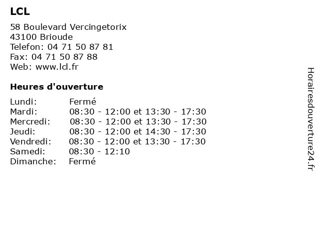 | Lundi | Fermé |