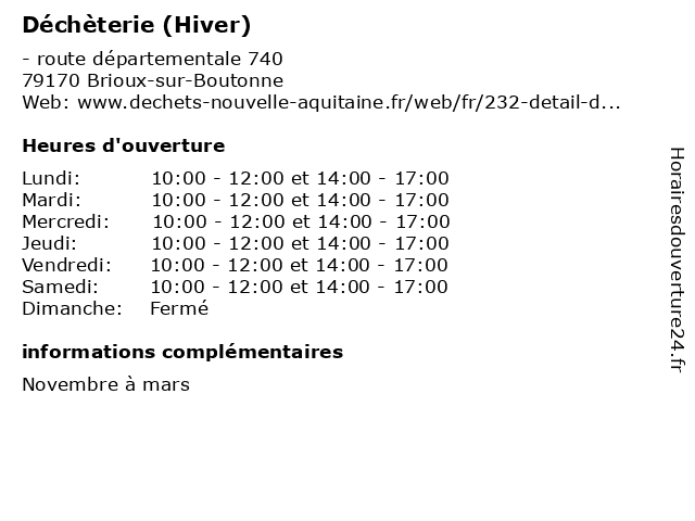 1 Déchèterie (Hiver) (Distance: 10,79 km) - Bois de Garennes, 79500 Melle bennes, collecte, débarras, déchets, déchèterie, hiver, ordures 2 Déchèterie (Hiver) (Distance: 13,32 km) - lieu-dit Chail, 79500 Saint-Vincent-la-Châtre bennes, collecte, déchets, déchèterie, détritus, hiver, poubelles 3 Déchèterie (Hiver) (Distance: 14,42 km) - Route des Pâtureaux les Ombrails, 79370 Celles-sur-Belle bennes, collecte, débarras, déchets, déchèterie, hiver, ordures 4 Déchèterie (Hiver) (Distance: 15,76 km) - Lieu-dit la Gadrouille, 79230 Prahecq bennes, collecte, débarras, déchets, déchèterie, hiver, ordures 5 Déchèterie (Hiver) (Distance: 17,77 km) - Route de Fressine, 79370 Mougon bennes, collecte, débarras, déchets, déchèterie, hiver, ordures 6 Déchèterie (Été) (Distance: 0,00 km) 32 route départementale 740, 79170 Brioux-sur-Boutonne bennes, collecte, débarras, déchets, déchèterie, ordures, été |