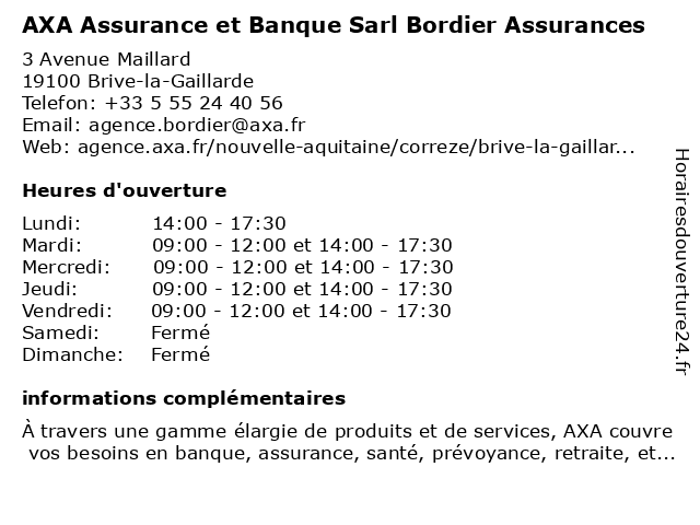 1 Axa Assurance (Distance: 0,00 km) 3 Avenue Maillard, 19100 Brive-la-Gaillarde assurance, axa, prévoyance, sante, services 2 AXA Assurance J. LABRUNIE ET L. LASFARGUE (Distance: 0,23 km) 49 Avenue de Paris, 19100 Brive-la-Gaillarde assurance, assurance appartement, assurance auto, assurance entreprise, assurance epargne, assurance habitation, assurance maison, assurance professionnelle, assurance santé, assurance voiture, axa, banque, et, j., l., labrunie, lasfargue 3 Axa Assurance (Distance: 0,49 km) 1 Cours du 15 Août 1944, 19101 Brive la Gaillarde agence, assurance, assurance prêt, assurances, axa, services 4 Axa Assurance (Distance: 0,81 km) 6 Place de l'Hôtel-de-Ville, 60430 Noailles assurance, axa, prévoyance, sante, services 5 AXA Assurance Yves Du Pradel (Distance: 1,04 km) 9 Avenue Alsace Lorraine, 19100 Brive-la-Gaillarde assurance, axa, du, pradel, yves 6 Caisse Primaire D'Assurance Maladie (Accueil téléphonique) (Distance: 1,08 km) 17 Avenue Alsace-Lorraine, 19100 Brive-la-Gaillarde accueil, administration, assoc, caisse, d'assurance, maladie, primaire, services, services publics, téléphonique |