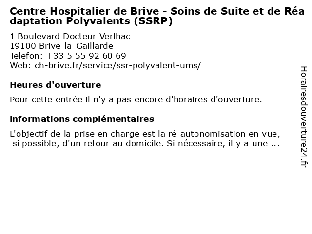 | Appeler Centre Hospitalier de Brive - Soins de Suite et de Réadaptation Polyvalents (SSRP) | |