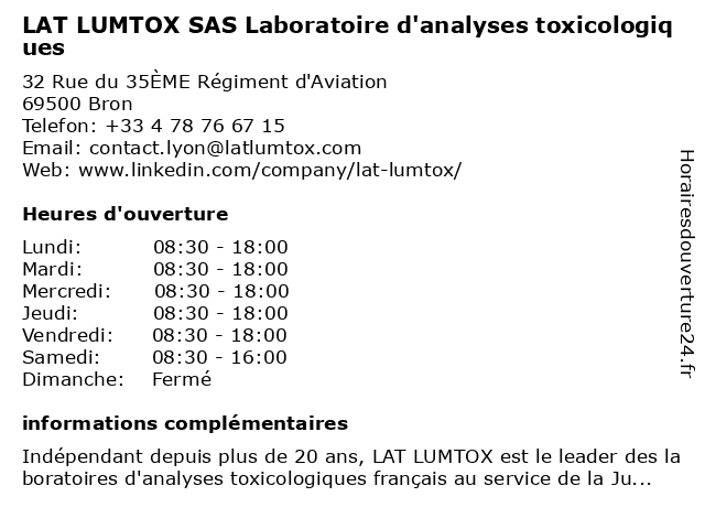 Termes de recherche pour LAT LUMTOX SAS Laboratoire d'analyses toxicologiques:d'analyses, laboratoire, sas, lat, lumtox, toxicologiques |