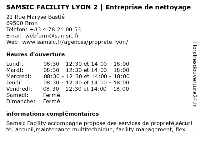 1 SAMSIC FACILITY LYON 3 | Entreprise de nettoyage (Distance: 0,00 km) 21 Rue Maryse Bastié, 69500 Bron accueil en entreprise, de, energy management, entreprise, environnement, espace verts, facility, facility management, factotum, gestion des déchets, gestion du bâtiment, handyman, hygiène 3d, logistique, lyon, maintenance multitechnique, nettoyage, nettoyage industriel, propreté, propreté agro-alimentaire, propreté pharmaceutique, samsic, sureté, sécurité, ultrapropreté 2 Kyriad Lyon Est Bron Eurexpo Le Cottage (Distance: 0,20 km) 12 Rue Maryse Bastie, 69500 Bron bar, bron, cottage, est, eurexpo, hotel, kyriad, le, lyon, restaurant, service 3 Comfort Hotel Kiotel Lyon Bron (Distance: 0,21 km) 10 Rue Maryse Bastie, 69500 Bron bar, bron, comfort, hotel, kiotel, lyon, restaurant, service 4 Kyriad Lyon Est Bron Eurexpo (Distance: 0,71 km) 2 Avenue Louis Mouillard, 69500 Bron bar, bron, est, eurexpo, hotel, kyriad, lyon, restaurant, service 5 B&B Hotel Lyon Eurexpo Chassieu (Distance: 3,26 km) 2 Rue Augustin Fresnel, 69680 Chassieu b&b, bar, cafe, chassieu, eurexpo, hotel, lyon, restaurant, service 6 PNI - Planète Nettoyage Industriel (Distance: 3,62 km) 67 Rue Aristide Briand, 69800 Saint-Priest façades vitrées, industriel, lavage des vitres, nettoyage, p.n.i, planète, pni, vitrines |