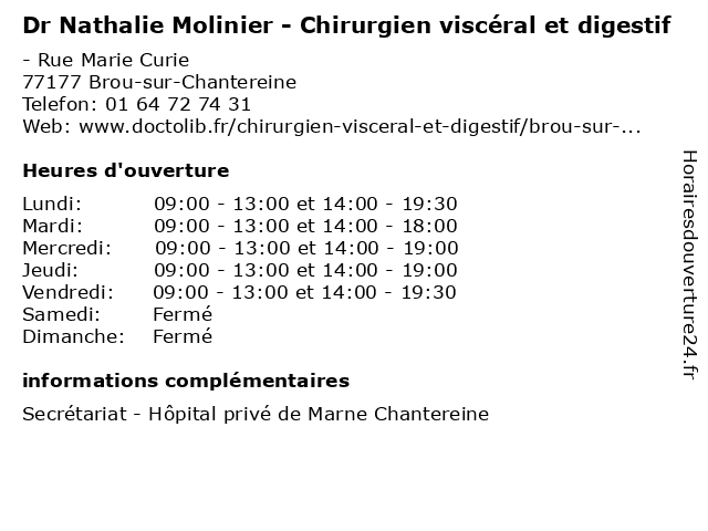 1 Dr Marie-Hélène Roullet - Chirurgien viscéral et digestif (Distance: 0,00 km) - Rue Marie Curie, 77177 Brou-sur-Chantereine chirurgien, consultation, digestif, docteur, dr, et, hélène, marie, med, médecin, médecine, roullet, secrétariat, traitement, viscéral 2 Dr Eric Poupardin - Chirurgien viscéral et digestif (Distance: 4,50 km) 10 Rue du Général Leclerc, 93370 Montfermeil chirurgie, chirurgien, digestif, dr, eric, et, general, poupardin, soins, viscéral 3 Dr Philippe Chiche - Chirurgien viscéral et digestif - secrétariat (Distance: 7,56 km) 38 Rue du Docteur Georges Assant, 93290 Tremblay-en-France chiche, chirurgien, consultation, digestif, docteur, dr, et, med, médecin, médecine, philippe, secrétariat, traitement, viscéral 4 Dr Bruno De Crepy - Chirurgien viscéral et digestif - secrétariat (Distance: 8,67 km) 135 Avenue Vauban, 93190 Livry-Gargan bruno, chirurgien, consultation, crepy, de, digestif, docteur, dr, et, med, médecin, médecine, secrétariat, traitement, viscéral 5 Dr Serigne Gueye - Chirurgien viscéral et digestif- secrétariat (Distance: 8,67 km) 135 Avenue Vauban, 93190 Livry-Gargan chirurgien, consultation, digestif, docteur, dr, et, gueye, med, médecin, médecine, secrétariat, serigne, traitement, viscéral 6 Dr Pierre Loc'h - Chirurgien viscéral et digestif (Distance: 8,80 km) 22 Avenue de la République, 77340 Pontault-Combault chirurgien, de, digestif, docteur, dr, et, francilienne, generaliste, générale, la, loc'h, medical, pierre, pôle, ramsay, santé, soin, viscéral |