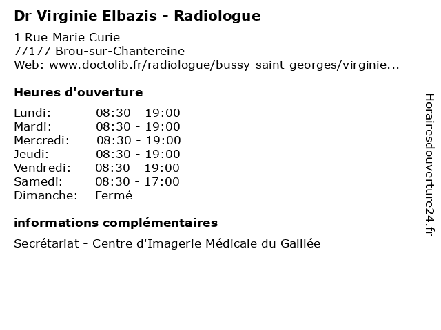 1 Dr Virginie Elbazis - Radiologue (Distance: 7,74 km) 7 Rue Konrad Adenauer, 77600 Bussy-Saint-Georges docteur, dr, elbazis, médecin, radiologie, radiologue, virginie 2 Virginie Le Stanc - Naturopathe (Distance: 2,11 km) 19 Rue Lucien Gallet, 77500 Chelles docteur, le, naturopathe, sante, soins, stanc, virginie 3 Morelli Virginie (Distance: 4,33 km) Les Heures Claires Residence Elie, 77500 Chelles morelli, restaurants, virginie 4 Dr Virginie El Bazis - Radiologue (Distance: 5,19 km) 8 Place du Bois de Grace, 77420 Champs-sur-Marne bazis, consultation, docteur, dr, el, med, médecin, radiologue, traitement, virginie 5 Dr Virginie El Bazis - Radiologue (Distance: 5,50 km) 7 Rue Vacheresse, 77400 Lagny-sur-Marne bazis, consultation, docteur, dr, el, med, médecin, radiologue, traitement, virginie 6 |