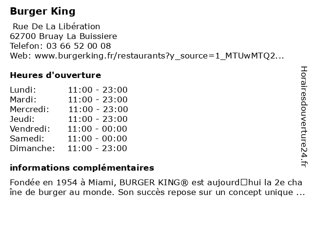 1 Burger King (Distance: 4,68 km) 582 Rue De La Faiencerie, 62400 Bethune bar & gril, burger, king, restaurant américain, restaurant de hamburgers, restaurant familial, restaurant à emporter 2 Burger King (Distance: 7,20 km) 2 Rue Le Rietz, 62290 Noeux-Les-Mines bar & gril, burger, king, restaurant américain, restaurant de hamburgers, restaurant familial, restaurant à emporter 3 Burger King (Distance: 15,39 km) 1 Rue Rudyard Kipling, 62138 Haisnes bar & gril, burger, king, restaurant américain, restaurant de hamburgers, restaurant familial, restaurant à emporter 4 Burger King (Distance: 15,66 km) 11-13 Rue François Courtin, 62800 Lievin bar & gril, burger, king, restaurant américain, restaurant de hamburgers, restaurant familial, restaurant à emporter 5 Burger King - Drive (Distance: 0,08 km) 919 Rue Eric Tabarly, 62700 Bruay-la-Buissière américain, burger, drive, fast, food, king, rapide, restaurant, restauration, sandwichs 6 Burger King - Salle (Distance: 4,25 km) - Zac de la Pierrette, 62400 Bethune américain, burger, burgers, fast, food, hamburger, king, menus, rapide, restaurant, restauration, salle |