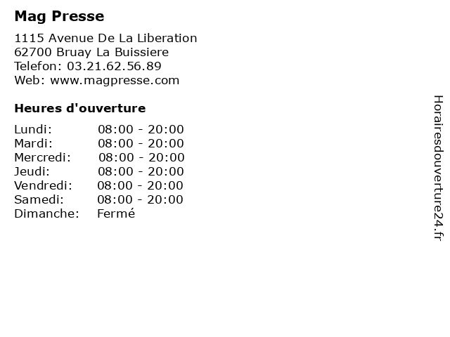 1 Mag Presse (Distance: 5,33 km) 483 Rue Benjamin Moloise, 62400 Bethune mag, magazine, presse, services 4 Mag Presse (Distance: 9,79 km) 37 Rue Du Maréchal Leclerc, 62114 Sains-en-Gohelle mag, magazine, presse, services 5 Mag Presse (Distance: 11,19 km) 8 Rue Nationale, 62550 Pernes En Artois mag, magazine, presse, services 6 Mag Presse (Distance: 15,29 km) 89-91 Rue Roger Salengro, 62330 Isbergues mag, magazine, presse, services |