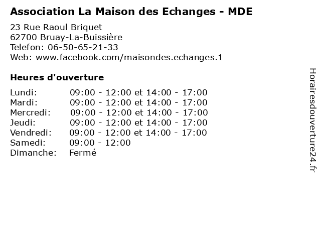 | Mardi | 09:00-12:00 et 14:00-17:00 |