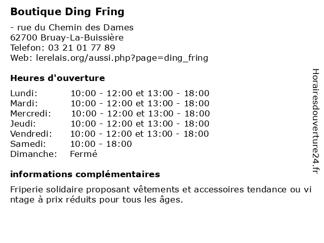 | Vendredi | 10:00-12:00 et 13:00-18:00 |