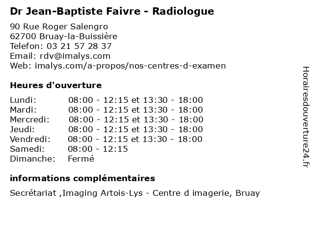1 Dr Jean-Baptiste Faivre - Radiologue (Distance: 4,02 km) Rue du Docteur Charles Legay, 62460 Divion baptiste, consultation, docteur, dr, faivre, jean, med, médecin, médecine, radiologue, traitement 2 Dr Jean-Baptiste Faivre - Radiologue (Distance: 9,50 km) 100 boulevard Basly, 62400 Béthune baptiste, consultation, docteur, dr, faivre, jean, med, médecin, médecine, radiologue, traitement 3 Dr Jean-Baptiste Faivre - Radiologue (Distance: 9,95 km) 880 Rue Delbecque, 62660 Beuvry baptiste, dr, faivre, jean, médecin, médecine, médical, pharmaceutique, radiologue, secretariat, traitement 4 Dr Jean-Baptiste Faivre - Radiologue (Distance: 10,41 km) 60 bis Rue de Verdun, 62190 Lillers baptiste, consultation, docteur, dr, faivre, jean, med, médecin, médecine, radiologue, traitement 5 Dr Baptiste Bonamy - Chirurgien-dentiste (Distance: 11,74 km) 10 Rue du Fossé Cave, 62190 Lillers baptiste, bonamy, chirurgien, dentaire, dentiste, dr, implantologie, parodontologie 6 |