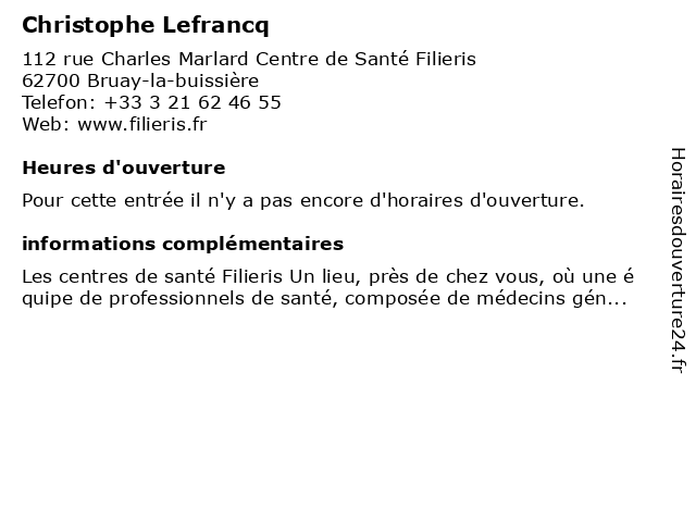 1 Godon Christophe Alexis Roger (Distance: 3,43 km) 62 Rue Achille Bodelot, 62460 Divion alexis, christophe, godon, restaurants, roger 2 Dr Christophe Lefrancq - Médecin généraliste (Distance: 7,54 km) 17 Rue Saint-Christophe, 62400 Béthune christophe, docteur, dr, generaliste, généraliste, lefrancq, medical, médecin, soin 3 Maître Christophe Loonis - Avocat (Distance: 8,57 km) 4 rue du Tribunal, 62400 Bethune avocat, avocats, christophe, civils, droits, juridiques, loonis, maître 4 Lidwin Christophe (Distance: 11,12 km) 16 Boulevard Vauban, 62114 Sains En Gohelle christophe, lidwin, restaurants 5 Boucherie Christophe (Distance: 17,89 km) 7 Rue d Acq, 62144 Haute Avesnes boucherie, boucheries, charcuterie, christophe, poissonneries 6 Lecoeuche Christophe (Distance: 18,07 km) 157 Rue Bournoville, 59660 Merville christophe, lecoeuche, restaurants |