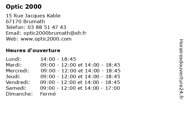 1 Optic 2000 (Distance: 8,77 km) - Route Nationale 63, 67450 Mundolsheim 2000, lunettes, optic, opticien, optique 2 Optic 2000 (Distance: 15,44 km) . Route de Herrlisheim, 67760 Gambsheim 2000, lunettes, optic, santé, solaires 3 Opticien Brumath - Optic 2000 (Distance: 0,09 km) 15 Rue Jacques Kablé, 67170 Brumath 2000, brumath, lentilles de contact, lunettes de soleil, lunettes de vue, optic, optic2000, opticien, opticien optic2000, ray-ban, rayban 4 Adom Optic (Distance: 6,90 km) 5 Rue de la République, 67720 Hoerdt adom, lentilles, lunettes, optic, opticien, optique, service 5 Optic Nicolas Schott (Distance: 11,03 km) 6 Place Joseph Thierry, 67500 Haguenau lentilles, lunettes, nicolas, optic, opticien, optique, schott, service 6 Optic Megastore (Distance: 11,60 km) 7 rue de Niederbronn, 67590 Schweighouse-sur-Moder de la mode, lentilles de contact, lunettes, megastore, optic, optique |
