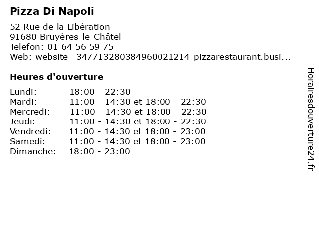 2 Pizza Di Napoli (Distance: 13,52 km) 31 boulevard de la Gribelette, 91390 Morsang Sur Orge di, napoli, pizza, restaurants 3 Pizza Di Napoli (Distance: 16,27 km) 7 Rue Du Martroy, 91610 Ballancourt-Sur-Essonne di, napoli, pizza, restaurants, restauration 4 Baïla Pizza (Distance: 4,18 km) . Rue Louise de Vilmorin, 91630 Avrainville baïla, italien, pizza, pizzeria 6 Espace Pizza (Distance: 4,65 km) 27 Boulevard Abel Cornaton, 91290 Arpajon espace, freres, pizza, restaurants |