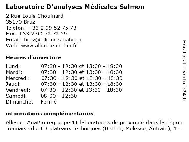 1 Alliance Anabio - Laboratoire d'Analyses Médicales (Distance: 0,02 km) 2 Rue Louis Chouinard, 35170 Bruz alliance, anabio, analyse, analyses, biologie, d'analyses, laboratoire, médical, médicale, médicales, prélèvement, prélèvements, santé 2 Laboratoire Bruz - BIOGROUP BRETAGNE (Distance: 0,41 km) 2 Square Daniel Balavoine, 35170 Bruz biogroup, bretagne, bruz, dépistages, laboratoire, laboratoire de diagnostic 3 LABORIZON BRETAGNE - Laboratoire Bruz (Distance: 0,41 km) 2 Square Daniel Balavoine, 35170 Bruz analyse de sang, bretagne, bruz, coronavirus, covid19, laboratoire, laboratoire d analyse médicale, laborizon, prise de sang, résultats, sérologie, test covid, test pcr 4 Isocelte - Laboratoire d'Essais Indépendant (Distance: 7,64 km) 1 Rue Emilie du Châtelet, 35580 Guichen consultant, consulter, d'essais, indépendant, ingénierie, ingénieur, isocelte, laboratoire 5 Laboratoire d'Analyses Médicales des Olympiades (Distance: 8,44 km) 77 Boulevard Albert 1er, 35000 Rennes analyses, d'analyses, des, laboratoire, médicales, olympiades, prélèvements, sang 6 Laboratoire des Olympiades (Distance: 8,73 km) 77 boulevard Albert 1er, 35200 Rennes alliance, anabio, biologie, de, des, laboratoire, laboratoires, medicales, olympiades, services |