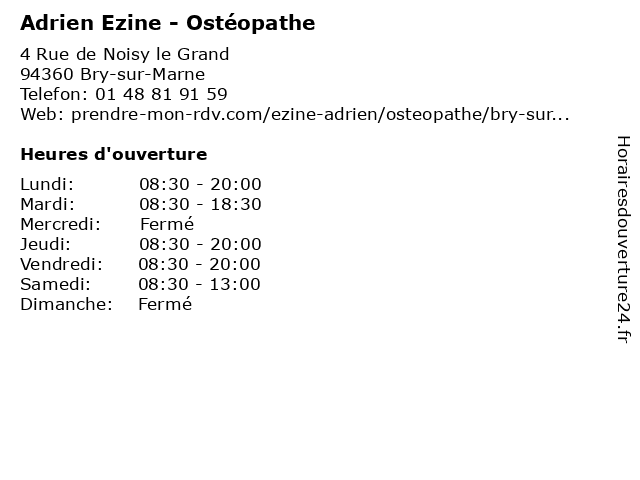 1 Maitres Pierre Richet, Didier Adrien, Elisabeth Mirlo et Magalie Hurtado - Notaires (Distance: 5,15 km) 37 avenue de Rosny, 93250 Villemomble adrien, didier, droits, elisabeth, et, hurtado, magalie, maitres, maître, mirlo, notaires, patrimoine, pierre, richet, spécialistes en droits 2 Dr Adrien Durand - Médecin généraliste (Distance: 5,25 km) 69 bis Avenue de la République, 94100 Saint-Maur-des-Fossés adrien, consultations, docteur, dr, durand, généraliste, médecin, médical 3 Dr. Peyre Adrien - Ostéopathe (Distance: 8,53 km) 41 Square Dufourmantelle, 94700 Maisons-Alfort adrien, docteur, dr., medecins, ostéopathe, peyre, sante 4 Dr Adrien Mamou - Chirurgien-dentiste (Distance: 11,35 km) 48 Rue Saint-Sébastien, 75011 Paris adrien, chirurgien, dentiste, dr, mamou, médecin, médecine, médical, pharmaceutique, traitement 5 Dr Adrien Kerkache - Médecin généraliste (Distance: 12,52 km) - Boulevard Robert Ballanger, 93600 Aulnay-sous-Bois adrien, consultation, docteur, dr, généraliste, kerkache, med, medecine, medical, médecin, traitement 6 Adrien David - Masseur-kinésithérapeute (Distance: 12,70 km) 4 Rue Edouard Quenu, 75005 Paris adrien, david, docteur, kinésithérapeute, masseur, médecin, médecine, secrétariat |