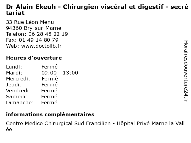 1 Dr Alain Nassif - Radiologue (Distance: 0,00 km) 33 Rue Léon Menu, 94360 Bry-sur-Marne alain, centre, d'imagerie, de, diagnostique, dr, hôpital, imagerie, imef, la, marne, médicale, nassif, privé, radiologie, radiologue, thérapeutique, vallée 2 Dr Philippe Vu Quoc Khanh - Chirurgien viscéral et digestif (Distance: 0,02 km) 33 Rue Léon Menu, 94360 Bry-sur-Marne chirurgien, consultation, digestif, docteur, dr, et, khanh, med, médecin, philippe, quoc, traitement, viscéral, vu 3 Dr Antonio Valenti - Chirurgien viscéral et digestif (Distance: 0,02 km) 33 Rue Léon Menu, 94360 Bry-sur-Marne antonio, chirurgien, consultation, digestif, docteur, dr, et, med, médecin, traitement, valenti, viscéral 4 Dr Mohand Achour - Chirurgien viscéral et digestif (Distance: 0,03 km) 33 Rue Léon Menu, 94360 Bry-sur-Marne achour, chirurgien, consultation, digestif, docteur, dr, et, med, mohand, médecin, traitement, viscéral 5 Dr Laurent Dugue - Chirurgien viscéral et digestif - secrétariat (Distance: 0,98 km) 2 Rue des Pères Camilliens, 94360 Bry-sur-Marne chirurgien, consultation, digestif, docteur, dr, dugue, et, laurent, med, médecin, médecine, secrétariat, traitement, viscéral 6 Dr Fnaiech Iskander - Chirurgien viscéral et digestif - secrétariat (Distance: 0,98 km) 2 Rue des Pères Camilliens, 94360 Bry-sur-Marne chirurgien, consultation, digestif, docteur, dr, et, fnaiech, iskander, med, médecin, médecine, secrétariat, traitement, viscéral |