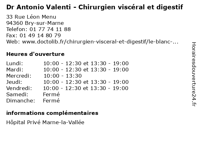 1 Dr Antonio Valenti - Chirurgien viscéral et digestif (Distance: 10,50 km) 28 Avenue du Quatorze Juillet, 93600 Aulnay-sous-Bois antonio, chirurgie, chirurgien, digestif, dr, et, general, soins, valenti, viscéral 2 Dr Antonio Valenti - Chirurgien viscéral et digestif (Distance: 12,31 km) 10 Rue Roger Salomon, 93700 Drancy abdominale, antonio, cancérologie, cancérologique, chirurgie, chirurgien, denis, digestif, digestive, dr, et, générale, hôpital, obésité, paroi, privé, saint, seine, thyroïde, valenti, viscéral 3 Dr Philippe Vu Quoc Khanh - Chirurgien viscéral et digestif (Distance: 0,00 km) 33 Rue Léon Menu, 94360 Bry-sur-Marne chirurgien, consultation, digestif, docteur, dr, et, khanh, med, médecin, philippe, quoc, traitement, viscéral, vu 4 Dr Mohand Achour - Chirurgien viscéral et digestif (Distance: 0,02 km) 33 Rue Léon Menu, 94360 Bry-sur-Marne achour, chirurgien, consultation, digestif, docteur, dr, et, med, mohand, médecin, traitement, viscéral 5 Dr Alain Ekeuh - Chirurgien viscéral et digestif - secrétariat (Distance: 0,02 km) 33 Rue Léon Menu, 94360 Bry-sur-Marne alain, chirurgien, digestif, dr, ekeuh, et, médecins, médicaments, santé, secrétariat, spécialiste, viscéral 6 Dr Laurent Dugue - Chirurgien viscéral et digestif - secrétariat (Distance: 0,97 km) 2 Rue des Pères Camilliens, 94360 Bry-sur-Marne chirurgien, consultation, digestif, docteur, dr, dugue, et, laurent, med, médecin, médecine, secrétariat, traitement, viscéral |
