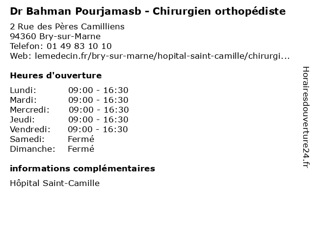 1 Dr Bahman Pourjamasb - Chirurgien orthopédiste (Distance: 11,45 km) 22 Rue de la Petite Saussaie, 94400 Vitry-sur-Seine bahman, chirurgien, consultation, docteur, dr, med, médecin, médecine, orthopédiste, pourjamabs, pourjamasb, secrétariat, traitement 2 Dr Firas Al Homsi - Chirurgien orthopédiste - secrétariat (Distance: 0,00 km) 2 Rue des Pères Camilliens, 94360 Bry-sur-Marne al, chirurgien, consultation, docteur, dr, firas, homsi, med, médecin, médecine, orthopédiste, secrétariat, traitement 3 Dr Catherine Gaudillat - Chirurgien orthopédiste - secrétariat (Distance: 6,12 km) 56 Boulevard Chilperic, 77500 Chelles catherine, chirurgien, consultation, docteur, dr, gaudillat, med, médecin, médecine, orthopédiste, secrétariat, traitement 4 Dr Pascal Mondolini - Chirurgien orthopédiste - secrétariat (Distance: 6,12 km) 56 Boulevard Chilperic, 77500 Chelles chirurgien, consultation, docteur, dr, med, mondolini, médecin, médecine, orthopédiste, pascal, secrétariat, traitement 5 Medecin Marc Sabourin (Chirurgien orthopédiste et traumatologue) (Distance: 6,75 km) 16 Avenue Jacques Heuclin, 77340 Pontault-Combault chirurgien, docteur, et, marc, medecin, orthopédiste, sabourin, sante, services, traumatologue 6 Medecin Cesar Vincent (Chirurgien orthopédiste et traumatologue) (Distance: 9,18 km) 41 Avenue du Maréchal Juin, 93260 Les Lilas cesar, chirurgien, docteur, et, medecin, orthopédiste, sante, services, traumatologue, vincent |