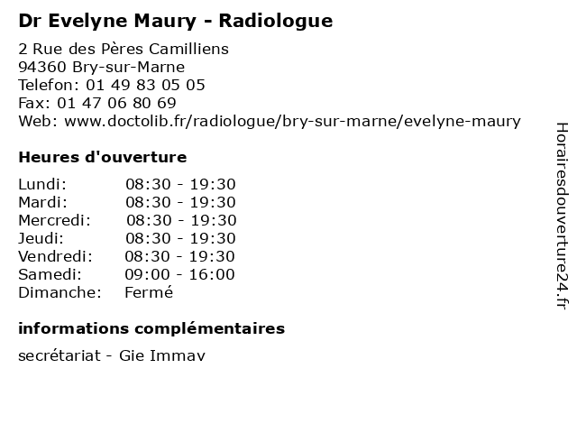 1 Dr Evelyne Maury - Radiologue (Distance: 14,60 km) 36 rue d'Assas, 75006 Paris 75006, arthur, dr, evelyne, imagerie, institut, maury, médicale, paris, radiologue, vernes 2 Dr Evelyne Marc - Anesthésiste (Distance: 0,11 km) 2 rue des Pères Camilliens, 94360 Bry-sur-Marne anesthésiste, consultation, docteur, dr, evelyne, marc, med, médecin, traitement 3 Dr. Evelyne Benaim - Dentiste (Distance: 1,69 km) 15 Rue Denfert Rochereau, 94170 Le Perreux-sur-Marne benaim, dentiste, docteur, dr., evelyne, medecins, sante 4 Evelyne Revellat - Sophrologue (Distance: 2,56 km) 188 Grande Rue Charles de Gaulle, 94130 Nogent-sur-Marne consultation, docteur, evelyne, médecin, médecine, revellat, secrétariat, sophrologue, traitement 5 Dr. Evelyne Goldenberg Lecomte - Chirurgien-dentiste (Distance: 3,22 km) 16 Rue Paul Bert, 94130 Nogent-sur-Marne actes et symptômes, chirurgien, dentiste, dr., evelyne, expertises, extraction dentaire, goldenberg, lecomte, medical 6 |