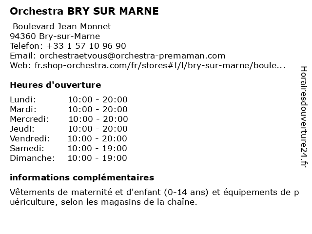1 Orchestra (Distance: 0,06 km) 19 Boulevard Jean Monnet, 94360 Bry-sur-Marne accesories, beaute, cafe, enfants, homme, mode femme, orchestra, restaurant 2 Orchestra (Distance: 2,98 km) . La Varenne, 63300 Thiers accessoires, maternite, mode enfant, orchestra, shorts, sport 3 Orchestra (Distance: 13,91 km) 23 Madeleine Vionnet, 93300 Aubervilliers aubervilliers, centre, commercial, millenaire, orchestra, vetements 4 Orchestra Premaman (Distance: 14,05 km) Neuf 20 Rue Du Pont, 75001 Paris accessoires, divers, habillement, magasins, orchestra, premaman 5 Orchestra (Distance: 14,43 km) 25 Boulevard Poissonnière, 75002 Paris accessoires, maternite, mode enfant, orchestra, shorts, sport 6 Orchestra (Distance: 14,65 km) . Le Haut de Galy, 93606 Aulnay-sous-Bois mode, orchestra, vêtements, vêtements de bébé |