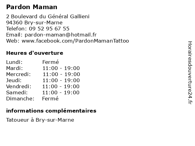 1 Pardon My Burger (Distance: 5,65 km) 8 allée des Écoles, 93110 Rosny-sous-Bois burger, fastfood, frites, my, pardon, restaurant, tacos 2 Maman Emoi (Distance: 6,27 km) 10 Rue Lejemptel, 94300 Vincennes boutique, emoi, grossesse, maman, vêtements 3 Dr Louis Maman - Chirurgien-dentiste (Distance: 10,07 km) 7 avenue de la République, 94200 Ivry-sur-Seine chirurgien, consultation, dentiste, docteur, dr, louis, maman, med, medecine, medical, médecin, traitement 6 |